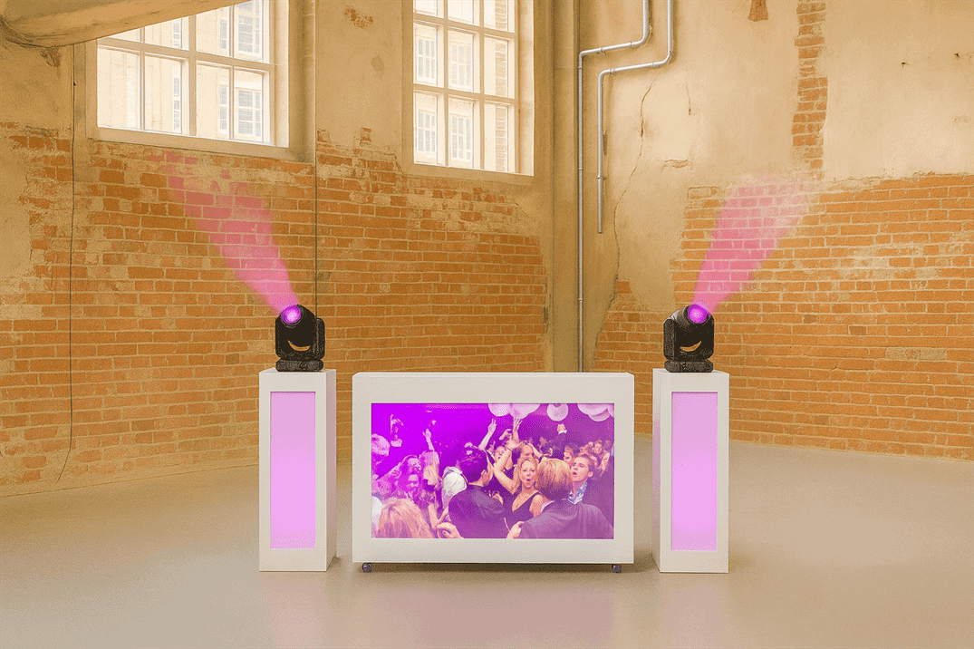 - Glossy wit DJ meubel met 55” scherm + 2 LED zuilen